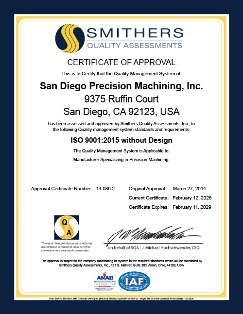Our commitment to quality is what defines San Diego Precision Machining Inc. We achieve this goal by using the latest equipment, a highly trained team and an extensive quality control and inspection program.